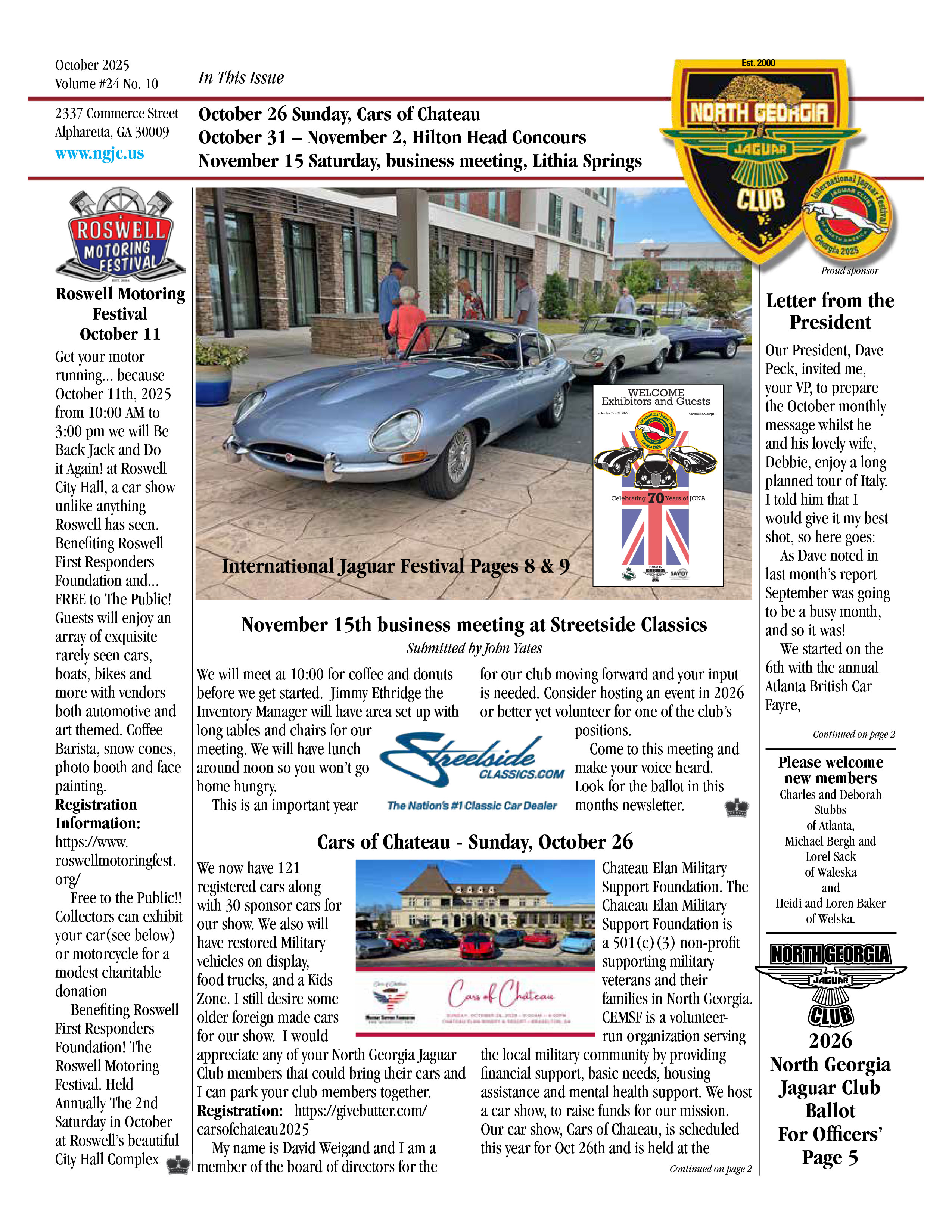 The North Georgia Jaguar Club was formed in November 2001 to provide a JCNA affiliated club for Jaguar enthusiasts in the northern half of Georgia, including the metro Atlanta area. NGJC is the only JCNA affiliated club in Georgia. We were honored to host the 2005 JCNA Challenge Championship when our club had been in existence only three years. NGJC's focus is the enjoyment, preservation and advancement of the Jaguar marque. Our events consist of driving tours, rallies, slaloms, tech sessions, and a JCNA sanctioned concours. Our members own both classic and new Jaguars. Call John Baxa at 770-642-7535(jwbaxamindspring.com) for membership information. All Jaguar enthusiasts are welcome to apply for membership.